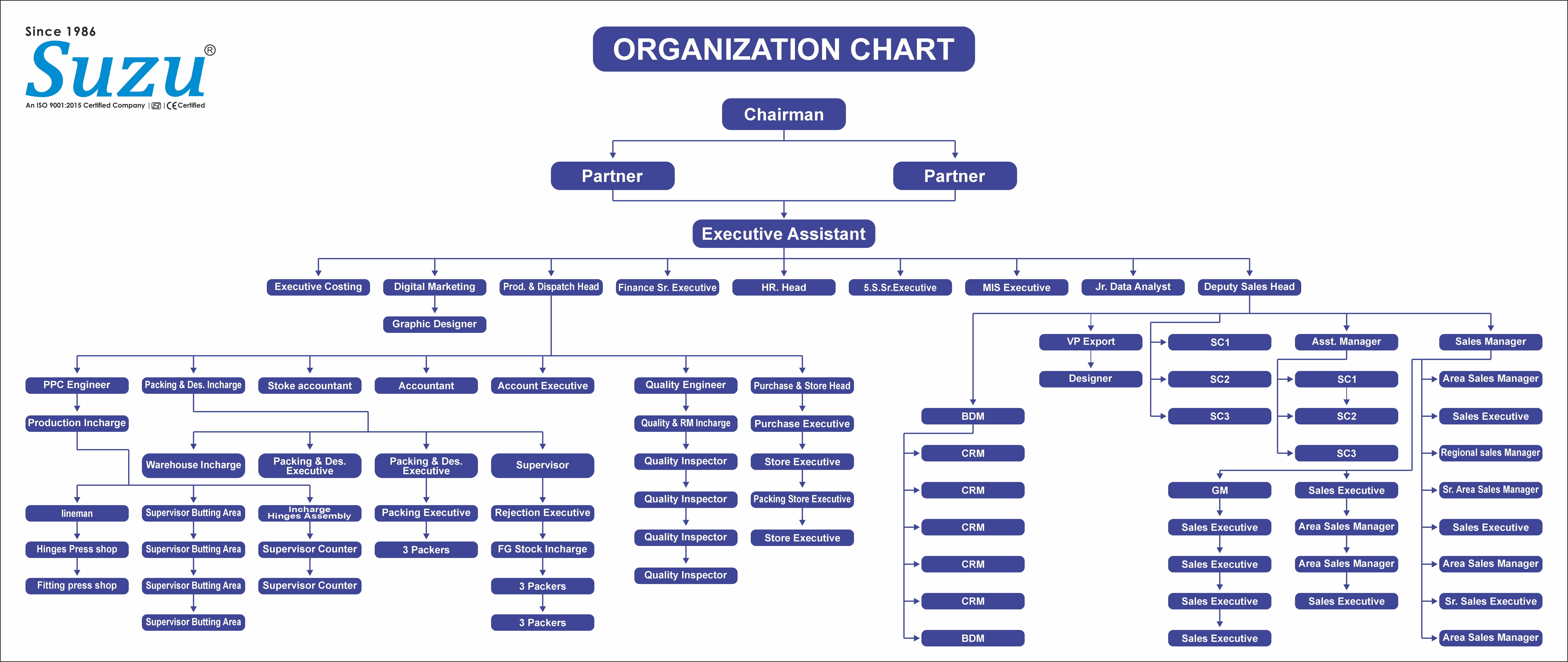 Since 1986, Suzu Steel (India) has been built on a foundation of clarity, discipline, and teamwork. Our organizational structure reflects how every department, every individual, and every process is connected with one vision – delivering world-class stainless steel hardware solutions.